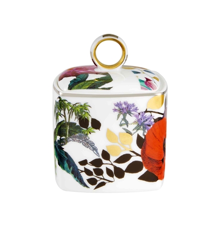 Sugar Box Primavera. Magenta dahlias, crimson poppies and buttercup yellow pansies mingle with lush vegetation that seems to be escaping from a labyrinth of immaculate stripes.